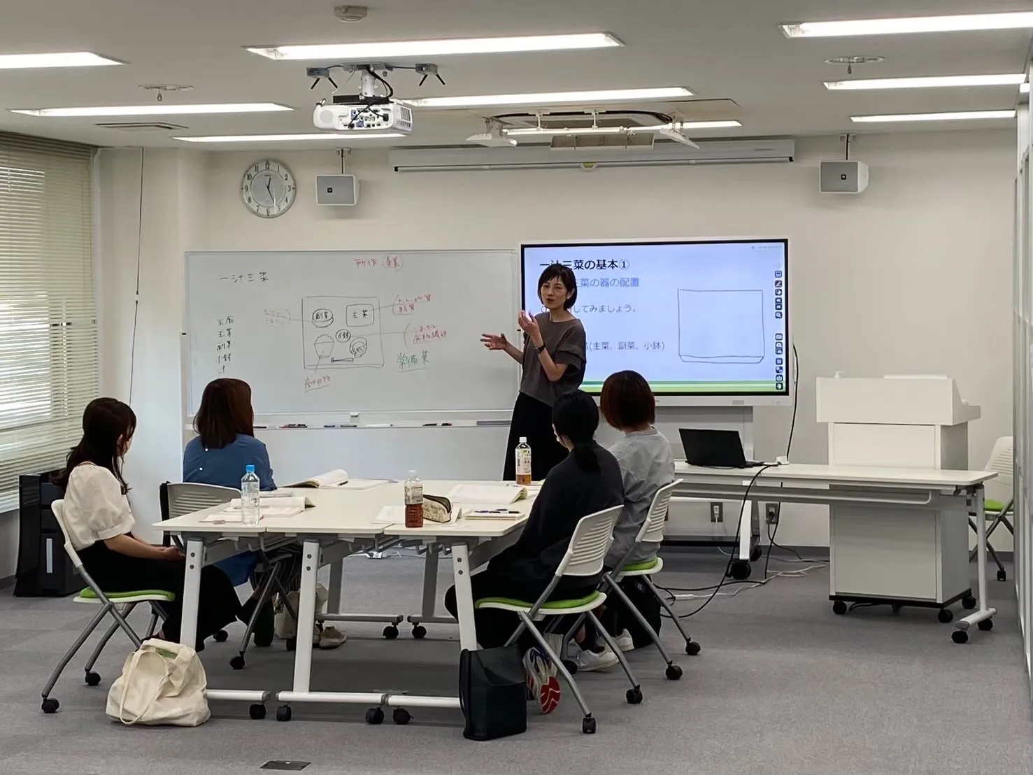 長机(11台)、椅子(31脚)/ワイヤレスマイク(2本)・ピンマイク(1本)/ホワイトボード(通常+電子)/ペン